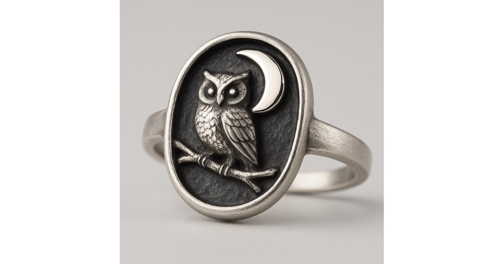 Sterling Silver Owl Moon Ring • Oxidized Night Sky Relief Ring • Cute Vintage Style Celest