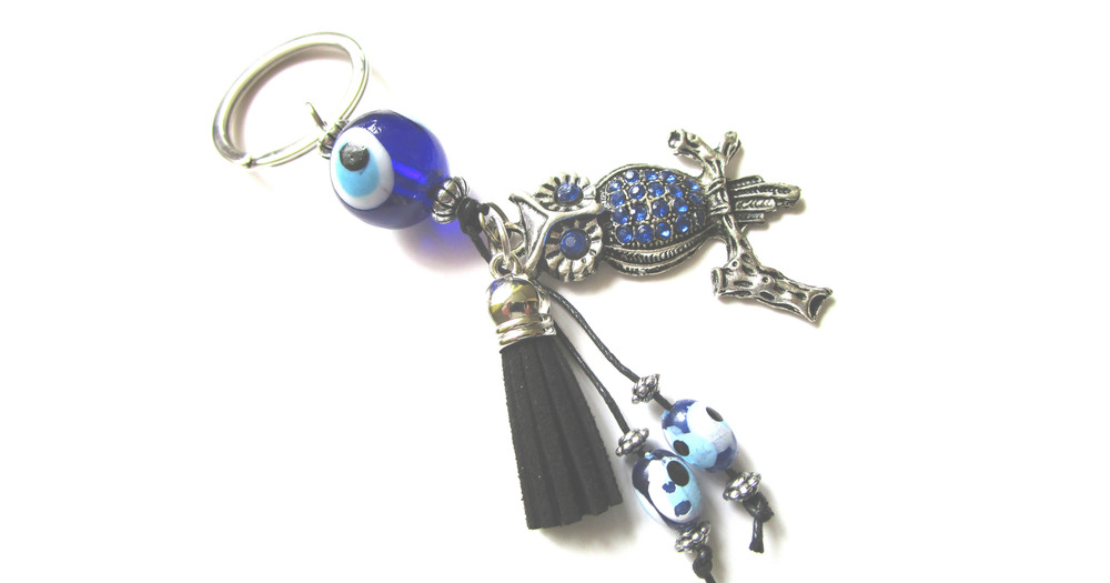 Blue owl blue evil eye charm key chain - black leather tassel - blue owl eye charm - evil eye key ch