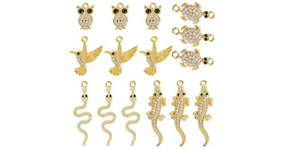 stino 50 Pieces 14K Gold Plated Animal Charms for Jewelry Making, Rhinestone Snake Turtle Owl Alliga