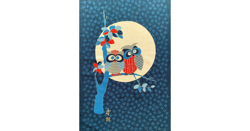 Japanese noren panel Owl Couple KP7290-92 blue