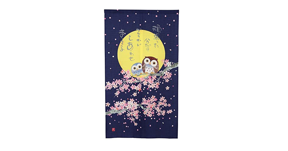 RLoncomix Japanese Noren Long Doorway Curtain Cherry Blossoms and Owls Under The Moon Door Curtain T