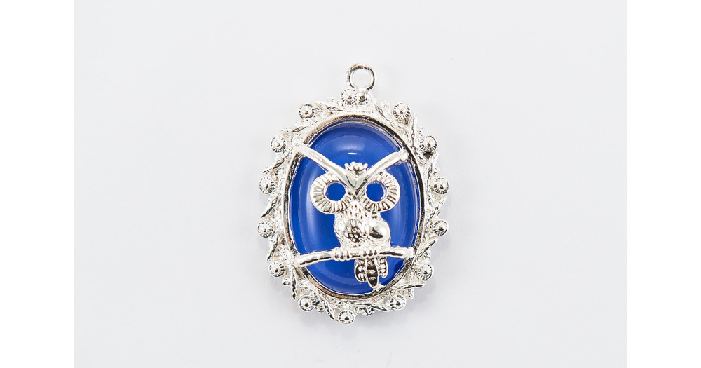 Owl Pendant, Silver with Blue/Purple Inlay, 38x32mm Oval, 1 count