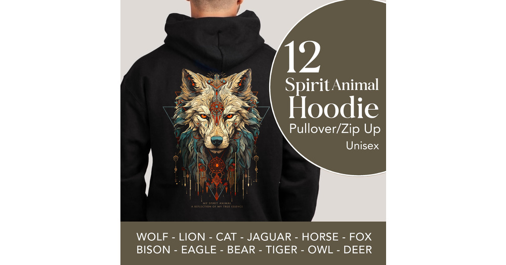 Spirit Animal Zip Hoodie: Owl, Eagle, Wolf, Fox, Jaguar, Horse, Deer, Lion, Bear, Tiger, Bison, Cat