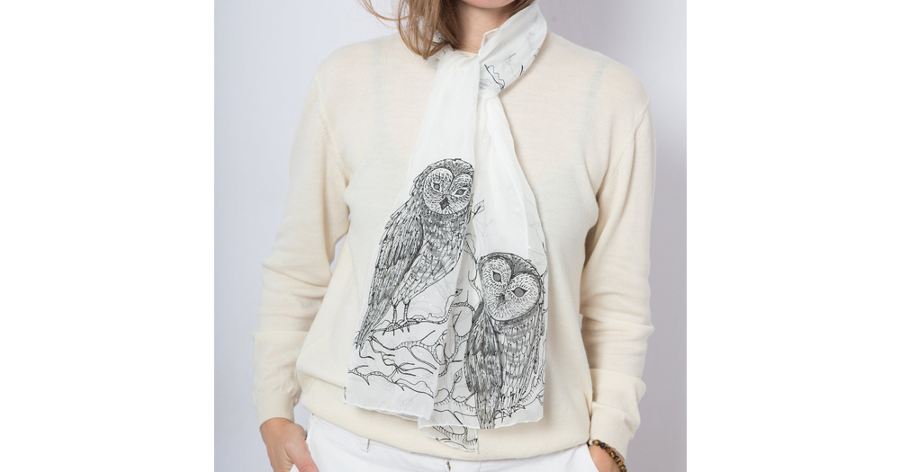 Owl Hand Painted White Silk Chiffon Bird Shawl Owl Gift Valentines Gift 57X16