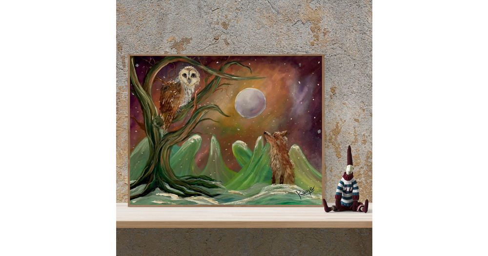 Fox and Owl Moonlight Painting: Woodland Animal Nursery Art