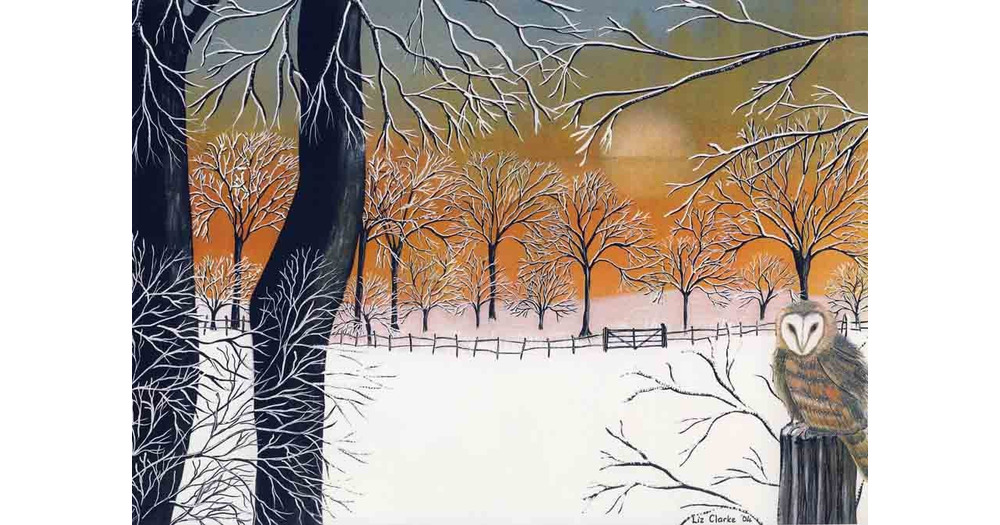 Art Print: "Owl's winter sunset" - A4 bird print, owl print, snow scene ,wall art, bar