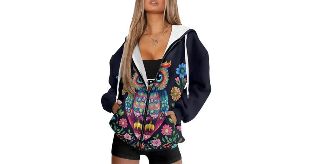 Qznuberone Owl Womens Zip Up Drawstring Hoodies Loose fit Sweatshirt Casual Long Sleeve Shirts for W