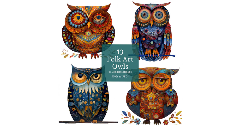 Decorative Owl Clipart, 13 High Quality PNGs/JPGs, Nordic Folk Art Bird Clipart, Paper/Digital Craft