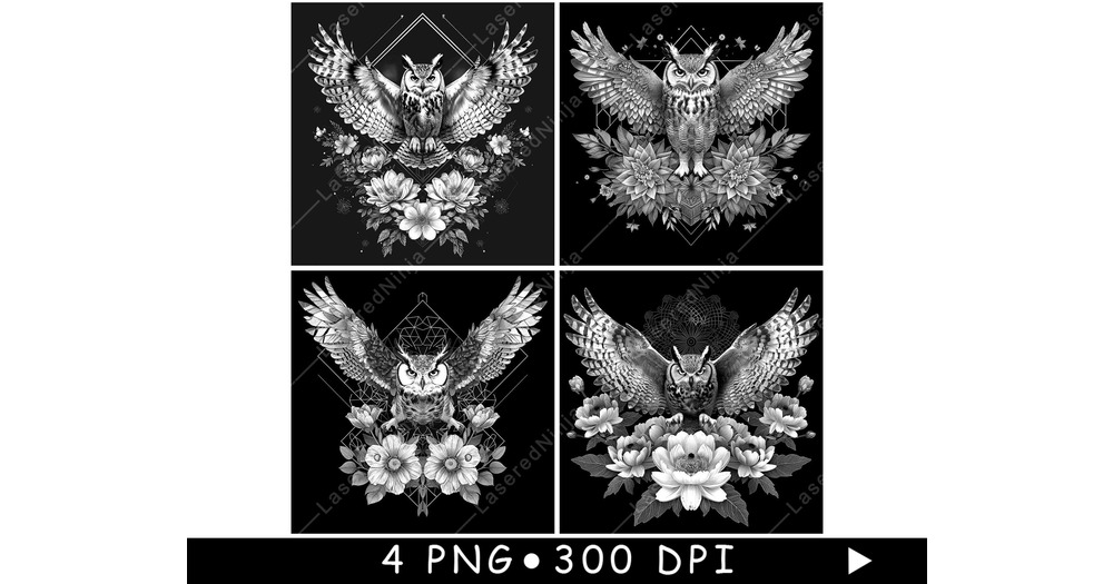 Owl and Floral Scene Bundle in Black and White Majestic Bird Designs with Flowers for Laser Engravin