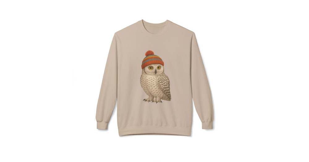 Winter Snowy Owl with Knit Colorful Beanie Sweatshirt | Cozy Woodland Bird