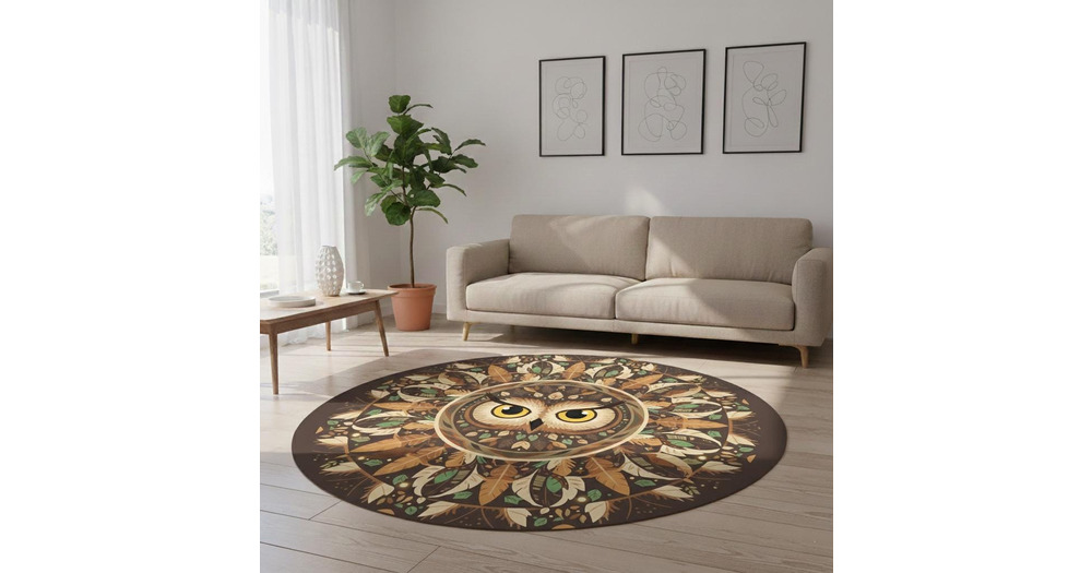 Woodland Owl Mandala Rug, Forest Feather Round Floor Mat, Washable Non-Slip Nursery Decor, Nature Lo