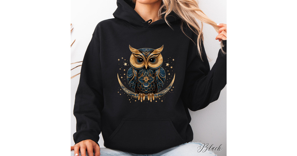 Celestial Owl Hoodie, Owl on Crescent Moon Hoody, Boho Christmas Hoodie, Folklore Vintage Hoodie, Bo