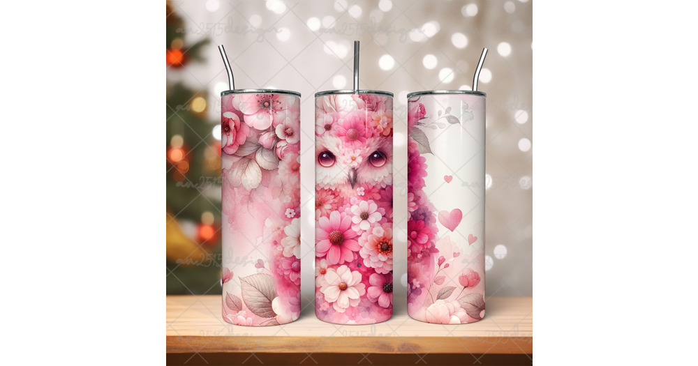 Pink Owl Flower 20 Oz Skinny Tumbler Sublimation Png, Pink Flower Valentine Tumbler Wrap Png Instant