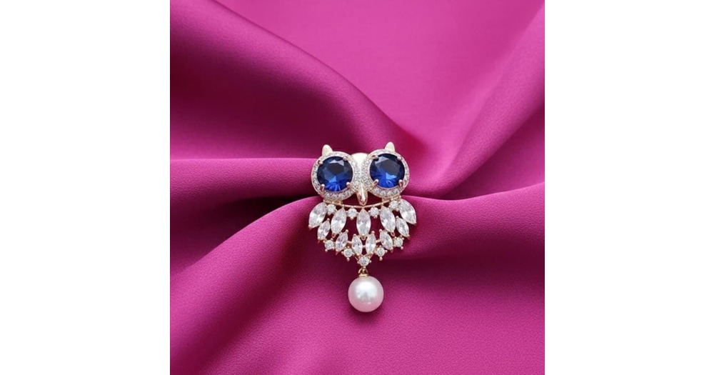 Blue Sapphire Owl Brooch Pin with Pearl Drop, 14K Gold Plated Crystal Bird Brooch, Vintage Statement
