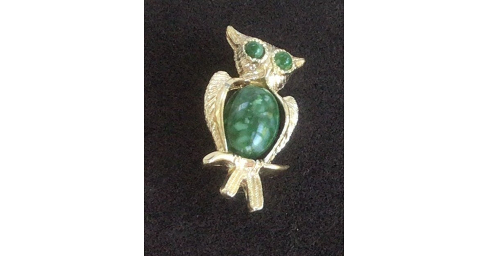Green, Gold tone Owl Pin, Brooch, Vintage (K15)