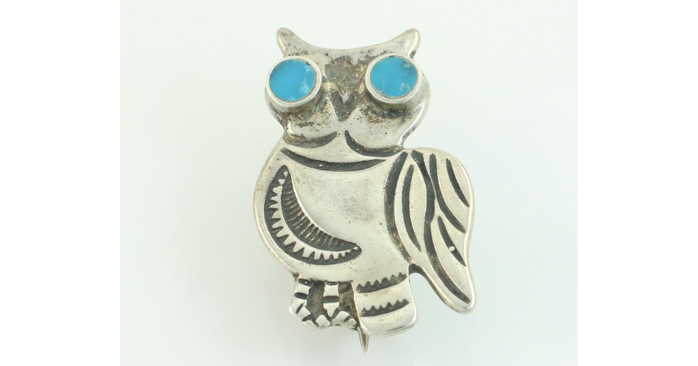 Vintage Sterling Silver Turquoise Owl Pin - Southwestern Brooch