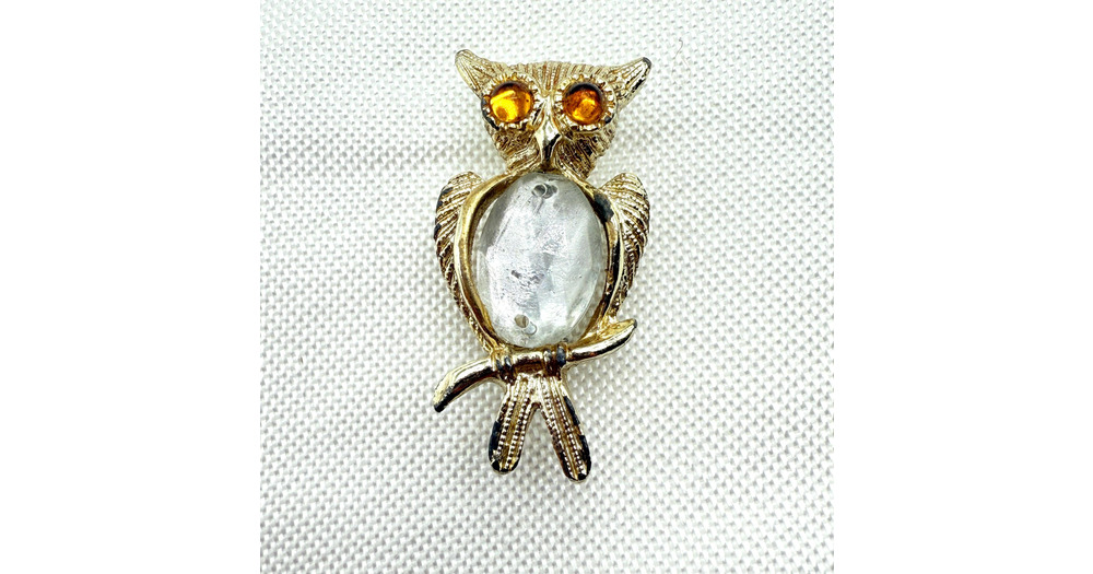 Vintage Gold Tone Owl Brooch w/ Orange Eyes and Clear Belly | Owl Lover Pin | Light Wear | Comes w/