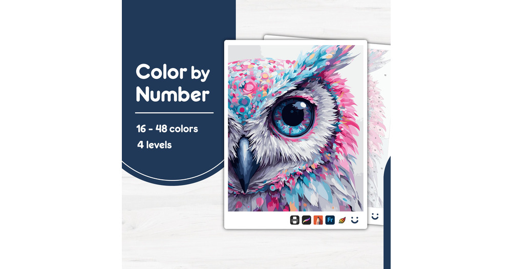 Blue Pink Owl Color by Number PBN for Procreate, Sketchbook, Prints, Easy/Advanced, Kid/Adult