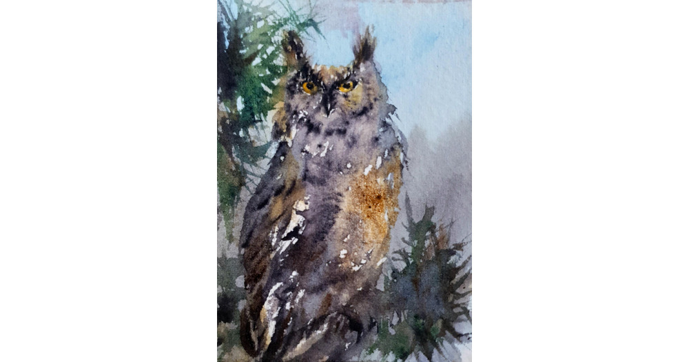 Owl portrait painting original ACEO watercolor of wild night forest bird collectable gift