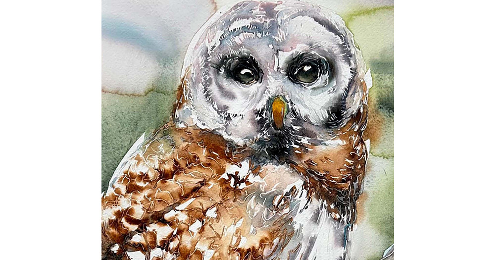 BARN OWL 22 x 15" watercolor of natural in organic scene with subtle gray and pleasant tones