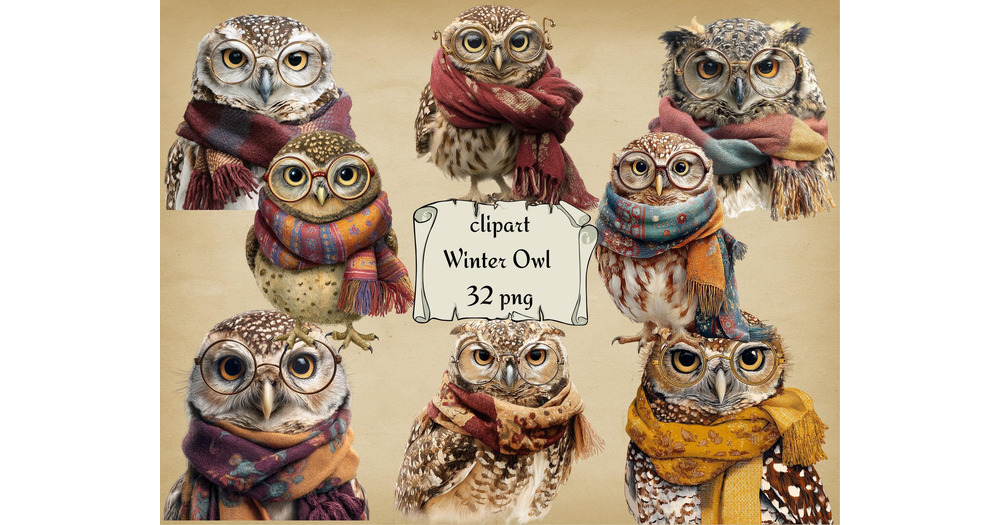 Winter Owl Clipart Bundle, Cute Owls with Scarves, Cozy Autumn Owl PNG, Woodland Animal Clipart, Tra