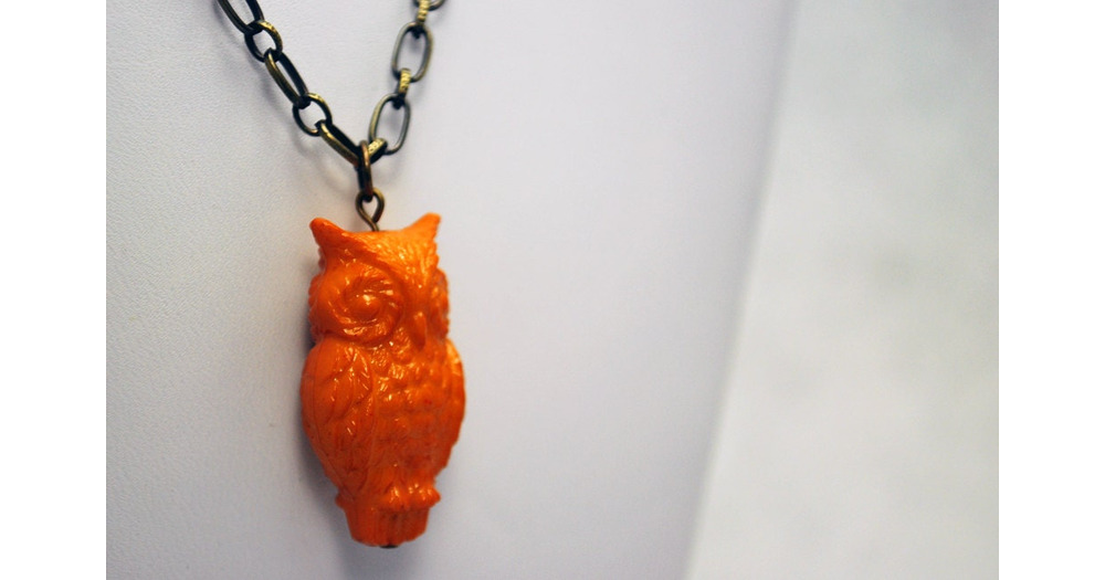 Sunset Orange Owl Necklace in Antique Brass - Vintage Lucite Necklace, Limited Edition Necklace, Woo