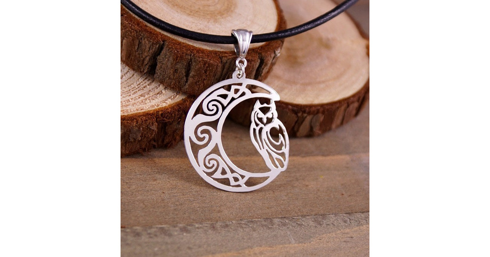 Celtic Crescent Moon and Owl - Hand Cut .925 Sterling Silver Pendant, Necklace