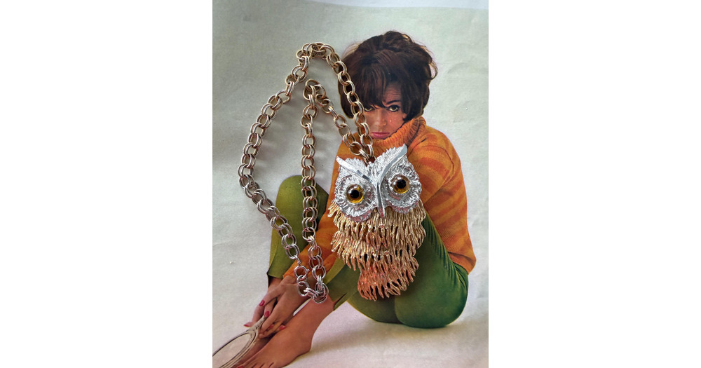 1970s Brutalist Owl Pendant Necklace Mixed Metal Gold Silver Chunky Statement Vintage Costume Articu