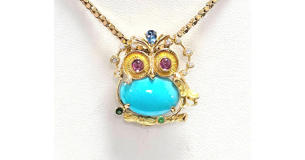 Incredible Vintage 18k Owl Pin/ Pendant with Turquoise, Diamonds & Semi-Precious Gems