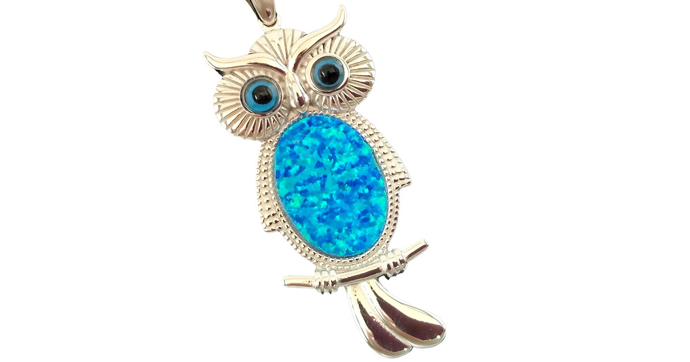 Sterling Silver 925 Owl Pendant with Blue Opal Inlay