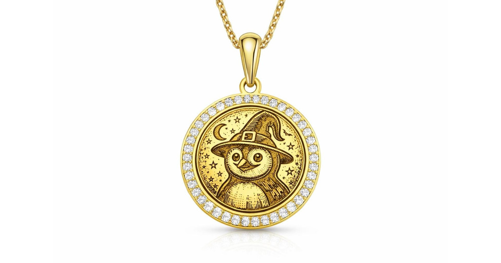 Witch Owl Pendant Necklace | Moissanite Gold Owl Medallion | Magic Wisdom Night Symbol Jewelry | Got