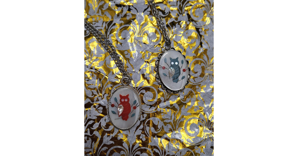 Two vintage Native American sterling silver owl pendant with mother-of-pearl, onyx, coral, and turqu