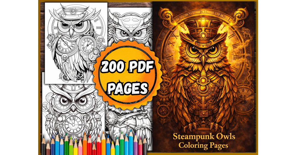 Steampunk Owls Coloring Pages – 200 PDF Pages