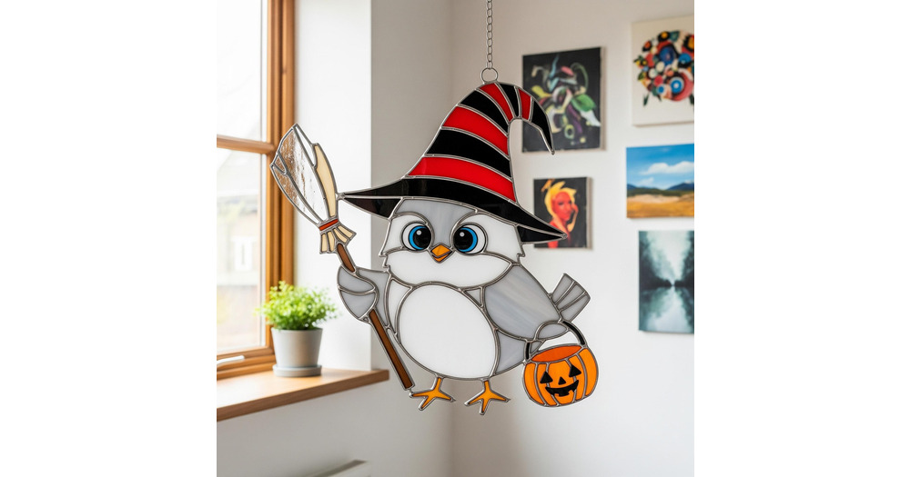 Halloween Owl Stained Glass Suncatcher, Owl With Witch Hat and Pumpkin Bucket Hanging Decor, Cute Sp