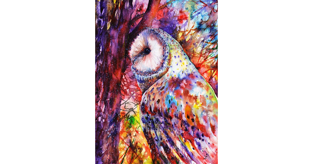 Colorful Barn Owl on Tree Art Print Bird of Prey Owls Watercolor Painting Branches Birds Wildlife Wo