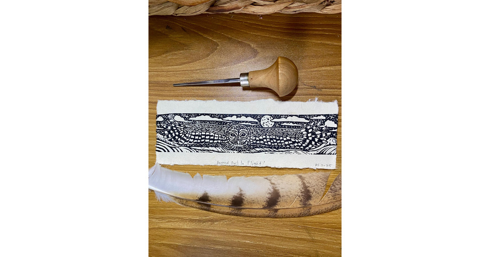 Barred Owl in flight mini Lino cut print on handmade Lokta paper