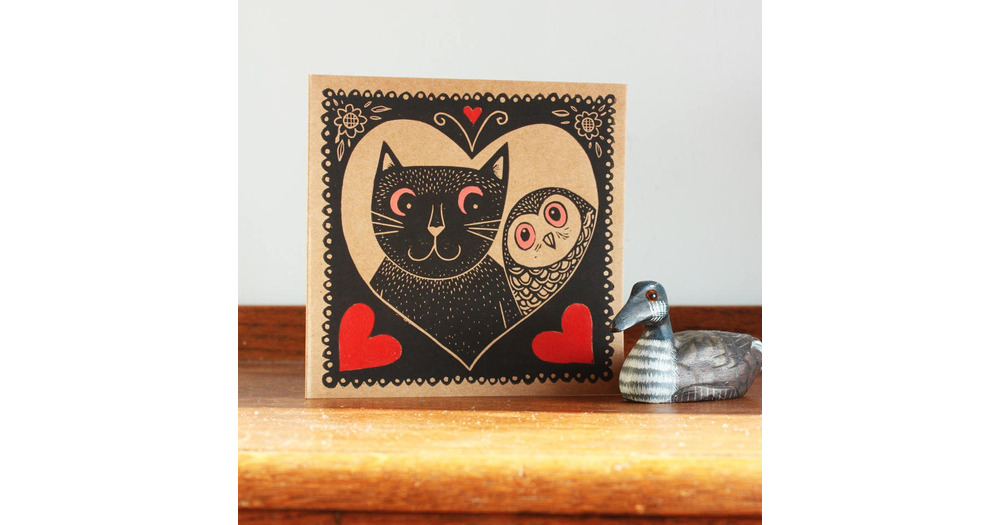Cat And Owl Linocut Print, Linocut Greeting Card, Cat and Owl Print, Cat Linoprint, Owl Linoprint,