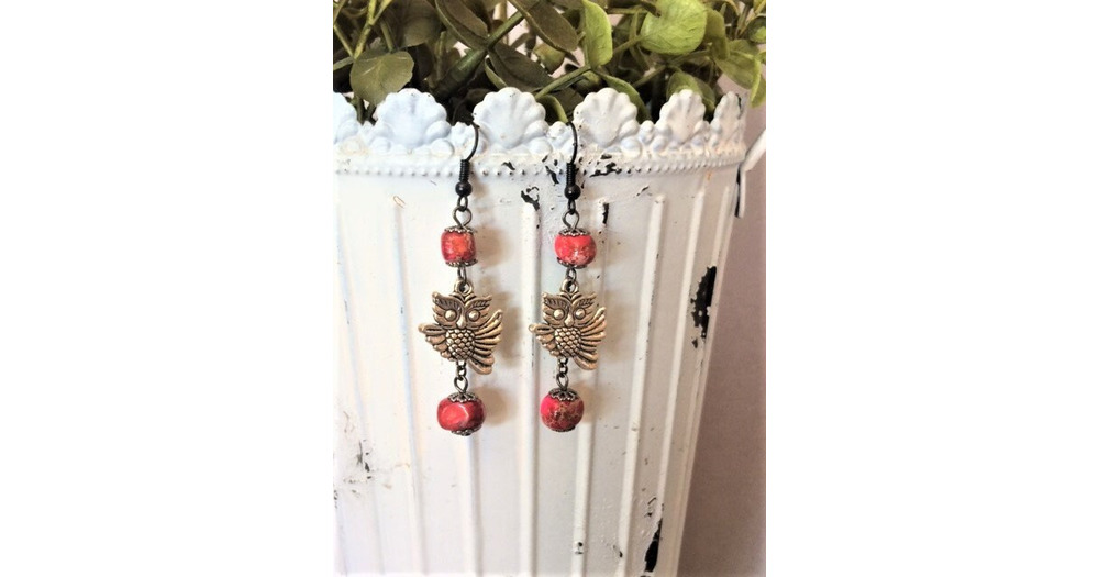 Pink and Antique Silver Owl Dangle Earrings; Pink and Black Owl Drop Earrings; Owl Dangle Earrings;