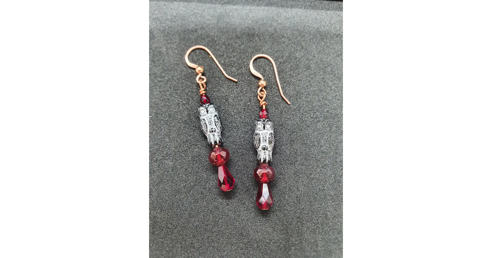 Gothic black owl and blood red rose drop copper dangle earrings.