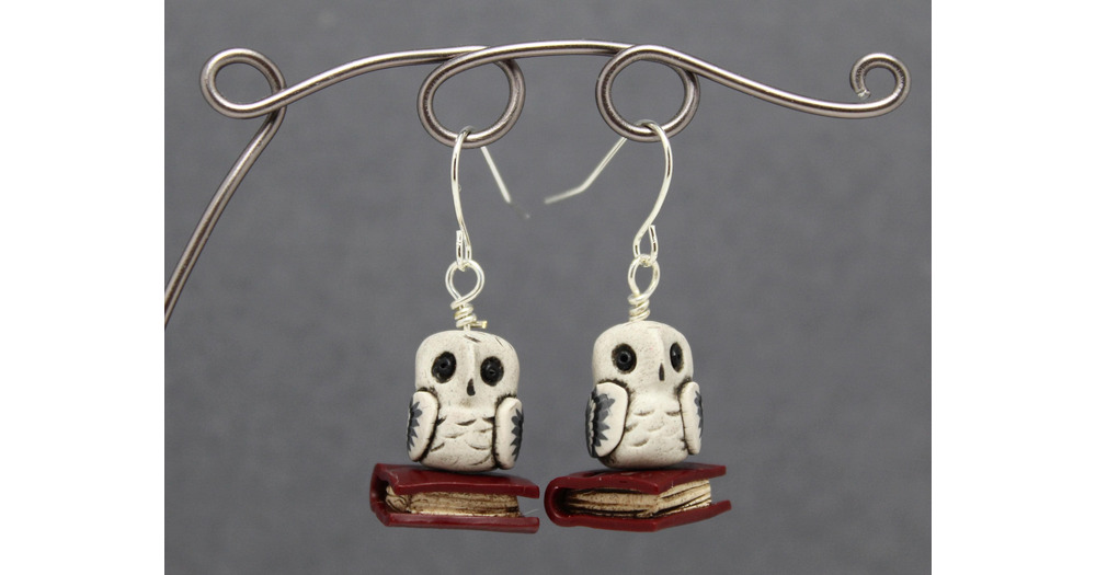 Owl and Book Dangle Earrings in White & Red Polymer Clay