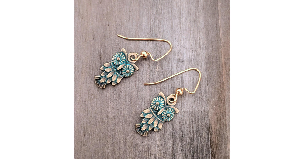 Patina Green Brass Owl Earrings, Vintage Style Dangle