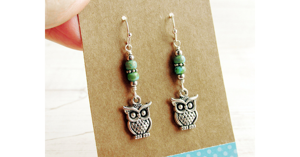Cute Silver Owl Dangle Earrings, Turquoise Blue Green Bead Earrings, Owl Jewelry, Owl Gifts