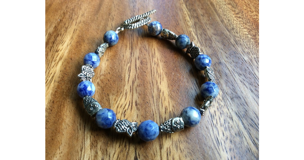 Blue & Silver Owls, beaded bracelet, denim color with silver accents.