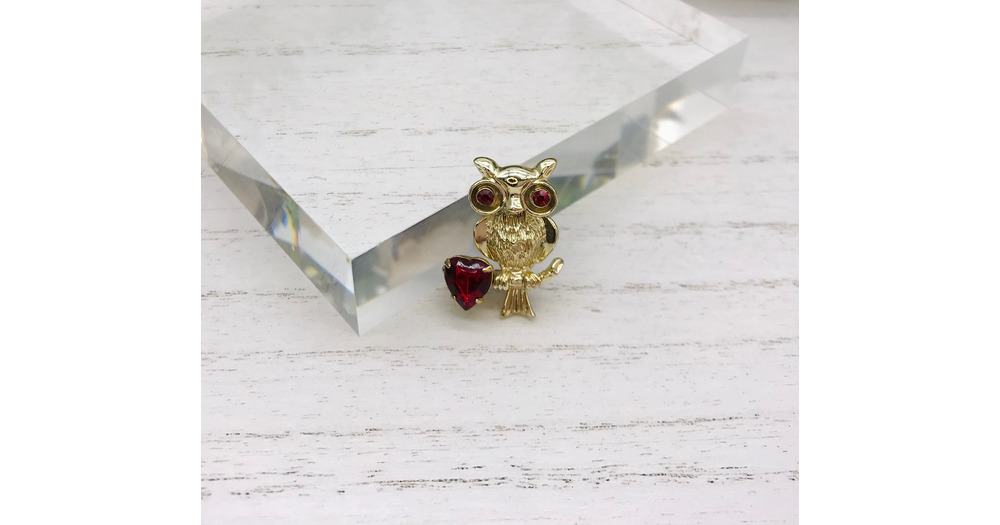 Vintage Pin Brooch Gold Toned Owl With Heart And Red Rhinestones Used