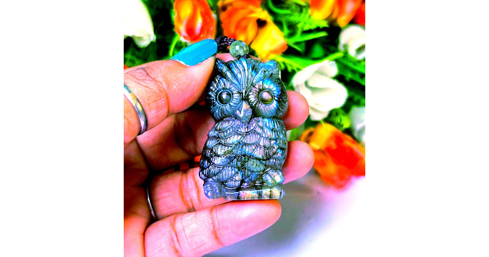 Labradorite Stone Owl Carving Pendant Necklace: Reiki Healing Gift