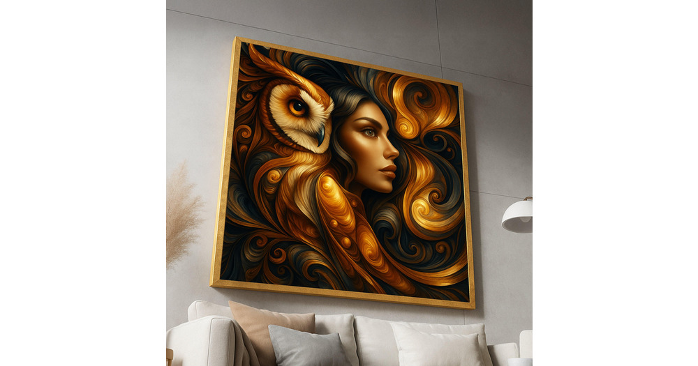 Mystical Woman and Owl Canvas, Golden Swirl Abstract Art, Surreal Animal Portrait Wall Art, Modern H