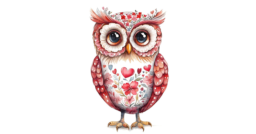 Owl Watercolor Clipart, Pink Flowers, Valentine’s Folk Art (15 JPG Files)