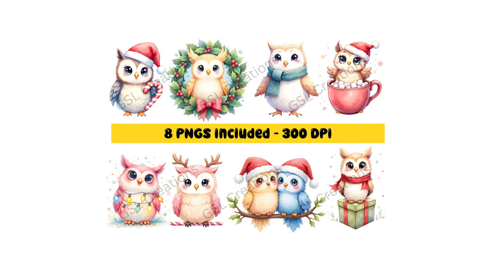Christmas Owl Clipart Set | Watercolor Holiday Animals (8 PNGs)