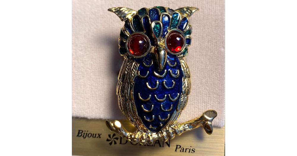 D'Orlan Owl Brooch, 22kt Gold Plated, Blue Enamel, Ruby Eyes