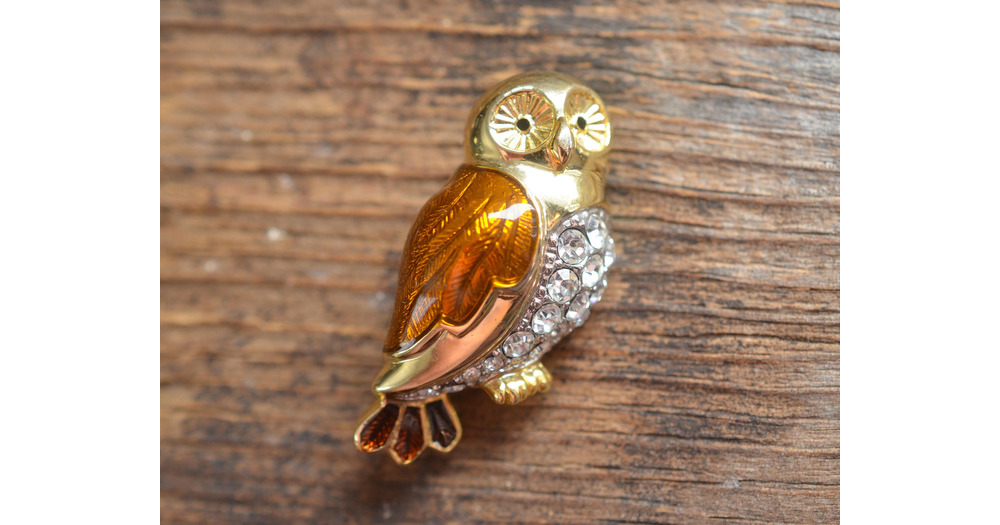 Vintage owl brooch, brown enameled wing and rhinestones, gold metal body, owl gift, owl jewelry
